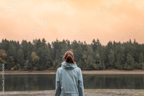 Young woman standing looking at a nature mountain lake setting. Travel and active lifestyle concept.