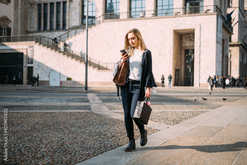 Young woman strolling in city square looking at smartphone