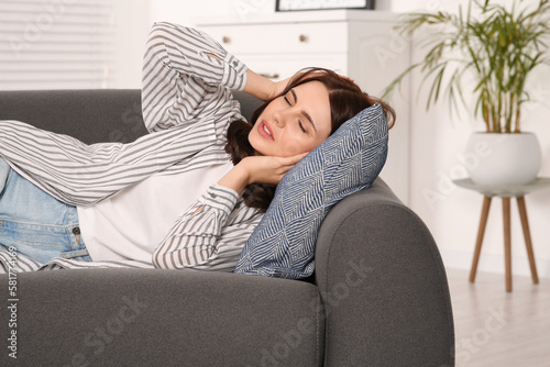 Young woman suffering from headache on sofa indoors. Hormonal disorders