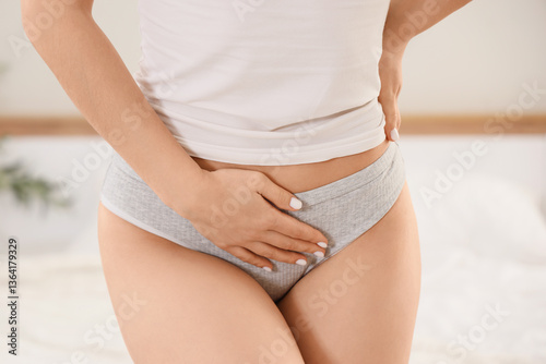 Young woman suffering from menstrual cramps at home, closeup