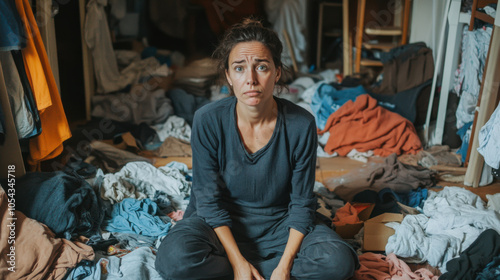 Young woman surrounded by messy clothes in a disorganized bedroom during the daytime