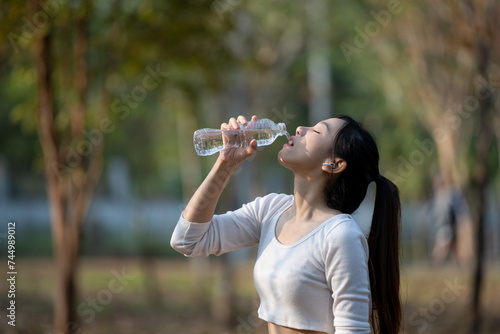 Young woman takes a break and drinks a water bottle after exercising in the park.