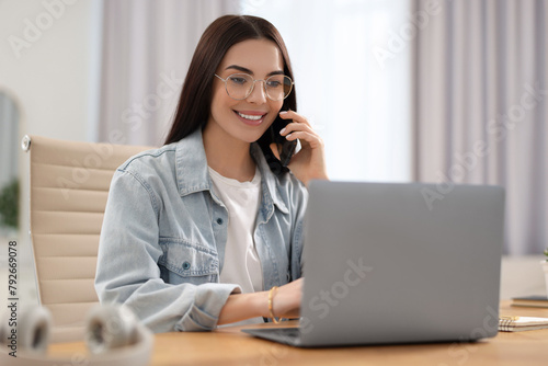 Young woman talking on smartphone during webinar at table in room