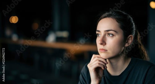 Young woman, thoughtful expression, side profile, dark hair, soft lighting, bokeh background, moody atmosphere