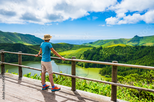 Young woman tourist standing on lookout terrace at Rasa Funda crater lake, Flores island, Azores, Portugal