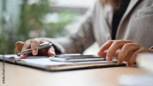 Young woman typing messages on mobile phone and writing notes