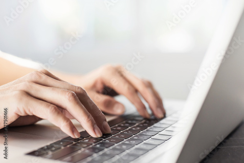 Young woman using laptop. Closeup of girl hands typing on computer indoors. Freelance, student lifestyle, education, technology and online shopping concept