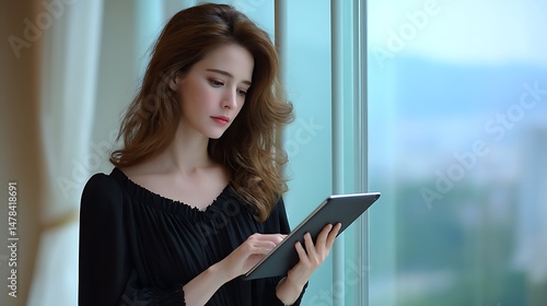 Young Woman Using Tablet Device Near Window with City View