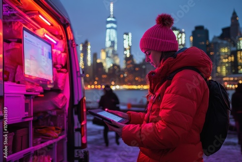 Young woman using tablet in food truck with vibrant neon lights against city skyline at dusk, showcasing urban lifestyle and technology integration in modern dining experience