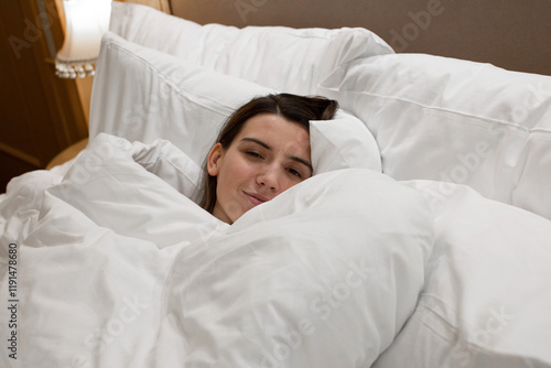 young woman waked up in cozy bed with soft pillows