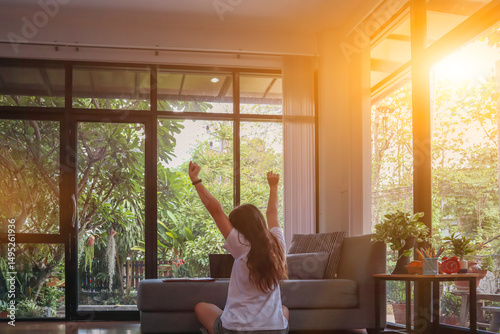 young woman wakes up in the morning the work from home concept because during the coronavirus covid-19 outbreak, travel in the community is prohibited to prevent the spread of the covid-19.