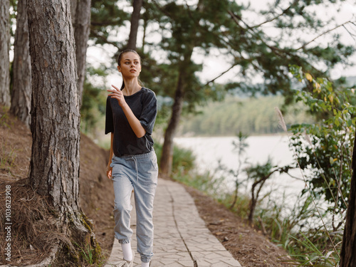Young woman walking along a scenic pathway by a lake, wearing casual attire and enjoying nature Serenity and outdoor exploration concept in a lush setting