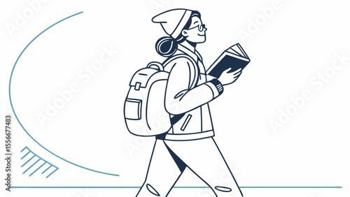 Young Woman Walking with Backpack and Reading Book. Minimalist Line Art Illustration for Education, Travel, or Student Life.