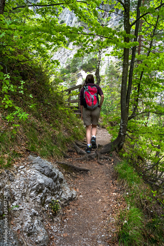 Young Woman Walks On Forest Hiking Trail In Ötschergräben In Austria