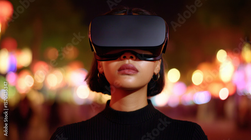 young woman wearing a virtual reality headset experiences immersive technology against a colorful, blurred night background.
