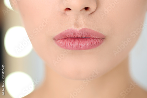 Young woman wearing beautiful lipstick on blurred background, closeup