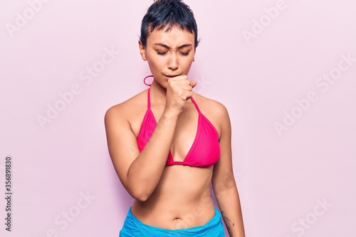 Young woman wearing bikini feeling unwell and coughing as symptom for cold or bronchitis. health care concept.