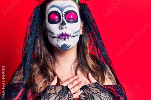 Young woman wearing day of the dead costume over red smiling with hands on chest, eyes closed with grateful gesture on face. health concept.