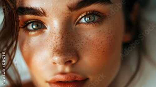 Young woman wearing natural makeup and styling her hair naturally Advertising of natural cosmetics Take care of your face and body.