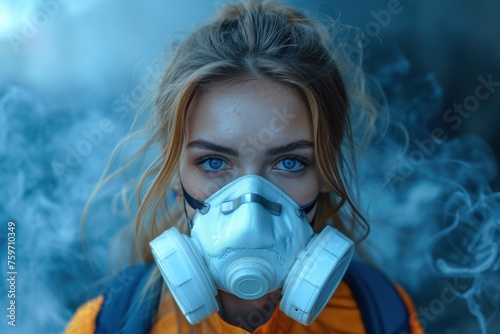 Young Woman Wearing Protective Mask Surrounded by Blue Smoke in a Controlled Environment