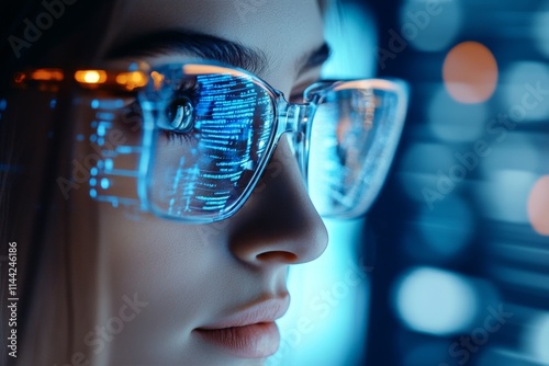 Young woman wearing smart glasses displays digital information with a futuristic background in a technology setting