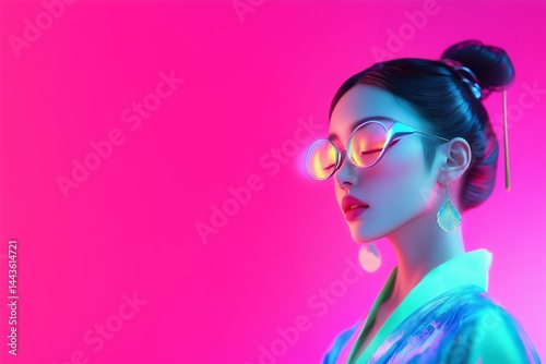 Young woman wearing stylish sunglasses poses against vibrant pink backdrop in an artistic setting