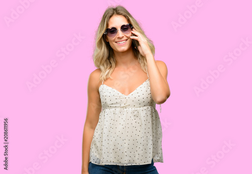 Young woman wearing sunglasses with heart shape happy talking using a smartphone mobile phone