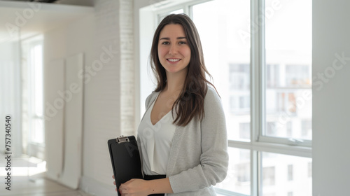 Young woman with a pleasant smile, holding a clipboard in her hands.