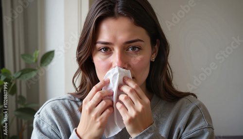 Young woman with a runny nose covering her nose with a tissue in a cozy indoor setting