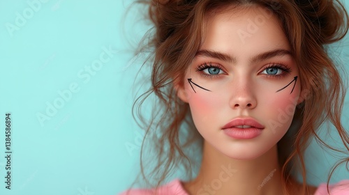 Young woman with arrows on face, spa skincare concept, soft lighting, minimalistic background.