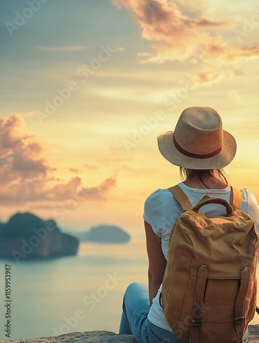 Young Woman with Backpack Enjoying Serene Island View at Sunrise : Generative AI