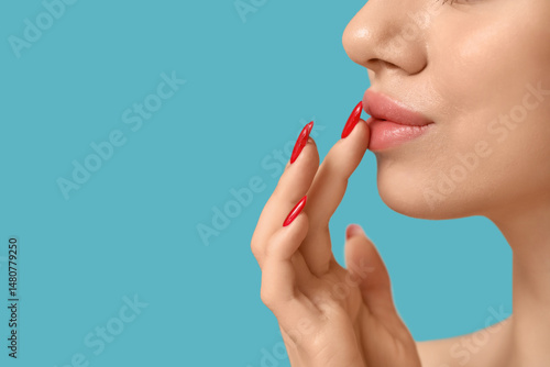 Young woman with beautiful lips on blue background, closeup