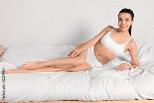 Young woman with beautiful smooth legs lying on bed at home