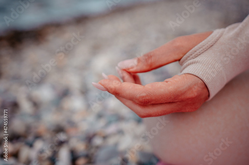 Young woman with black hair, fitness instructor in leggings and tops doing stretching and pilates on yoga mat near the sea. Female fitness yoga routine concept Healthy lifestyle harmony and meditation
