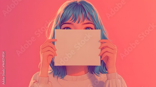 Young Woman with Blue Hair Holding Blank Paper in Front of Face on Pink Background