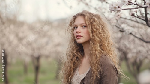 Young woman with curly blonde hair stands amidst blooming sakura trees, embodying serenity and natural beauty.