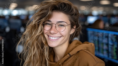 young woman with curly hair is smiling brightly in a contemporary office filled with computer screens. atmosphere is lively, suggesting a productive work environment