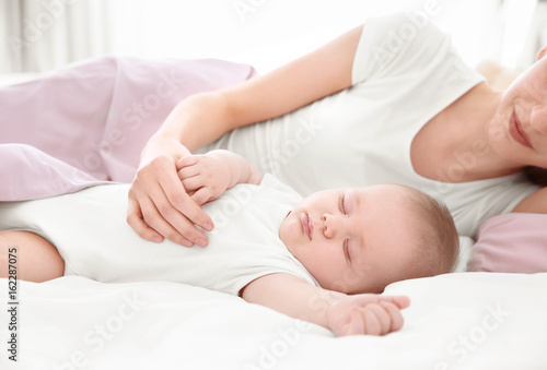 Young woman with cute baby sleeping on bed at home