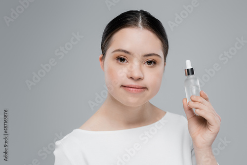 Young woman with down syndrome holding bottle of serum isolated on grey
