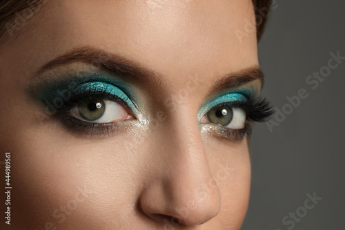 Young woman with evening makeup on grey background, closeup. Eye shadow product