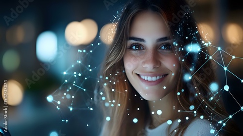 Young woman with glowing digital network overlay smiling against blurred bokeh lights background, representing artificial intelligence and future technology.