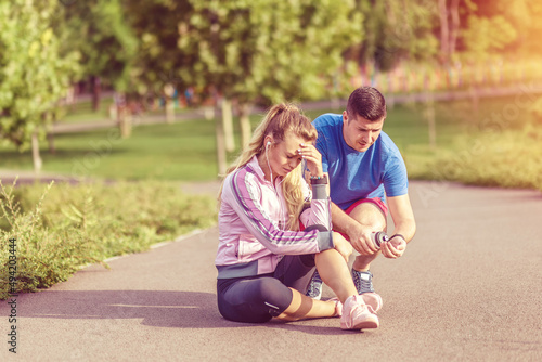 Young woman with knee injury while jogging outdoor helped by her male partner