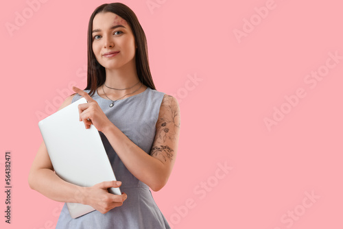 Young woman with laptop on pink background