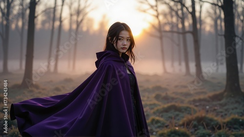 Young woman with long dark hair, pale skin in vampire cloak fluttering wind, standing in misty forest at sunset. Concept of Halloween, dreamy mystical atmosphere of twilight.