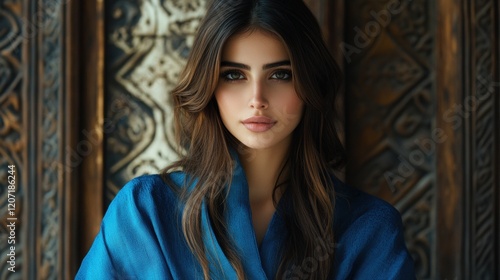 Young Woman with Long Hair in Elegant Blue Wrap and Decorative Background