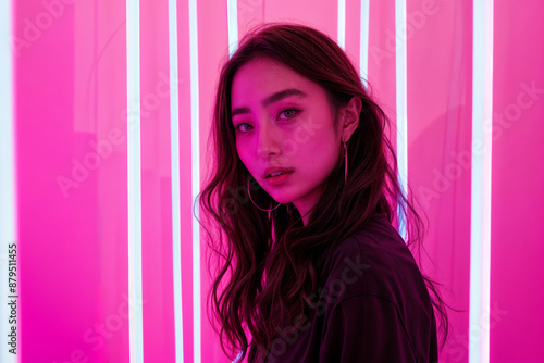 Young woman with long hair standing in pink neon-lit room, wearing hoop earrings, looking at camera, futuristic and vibrant setting, night scene