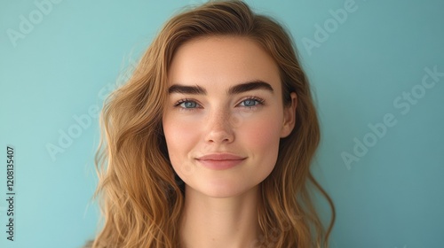 Young woman with natural beauty and long hair on blue background