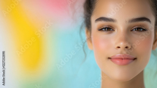 young woman with natural makeup and serene expression poses against colorful background. Her smooth skin and bright smile convey sense of calm and