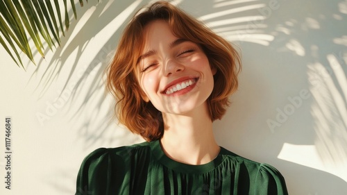 Young woman with short hair smiling with closed eyes under palm tree shadow sunny weather summer