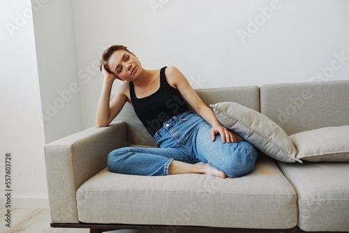 Young woman with short haircut hair having fun at home on the couch smile and happiness, vacation at home, natural posing without filters, free copy space